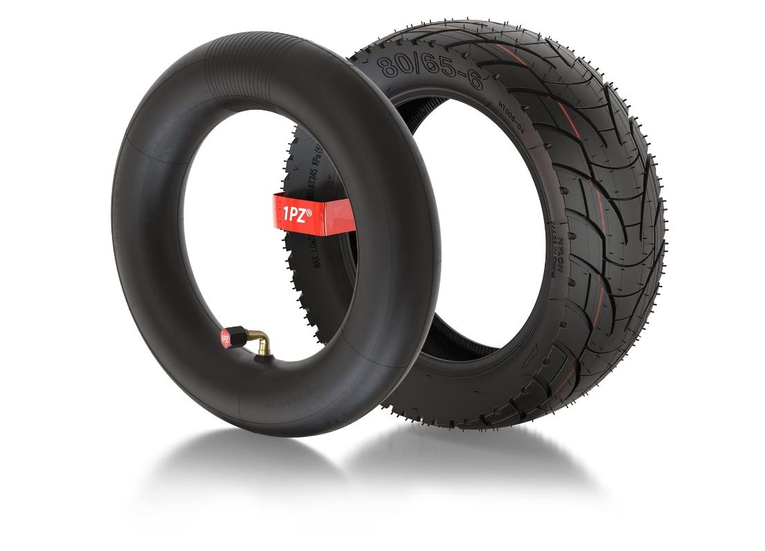 Комплект вътрешна и външна гума размер 80×65-6 (10X3.0 255×80) за електрически скутери KuGoo M4 / M4 Pro и Zero 10X. Вътрешната гума е с крив вентил 90 градуса.