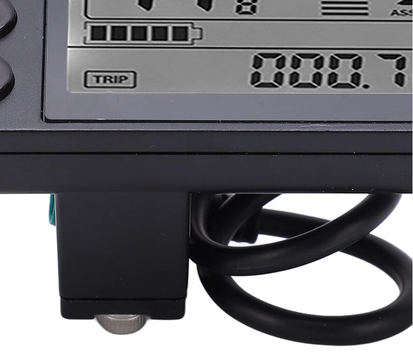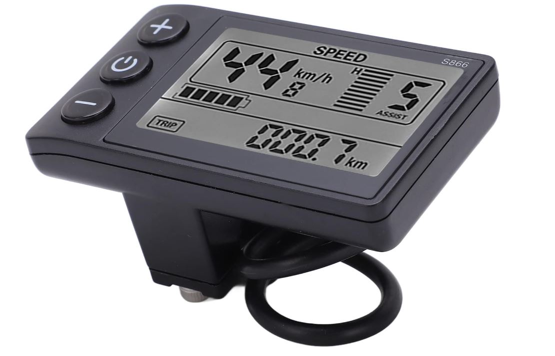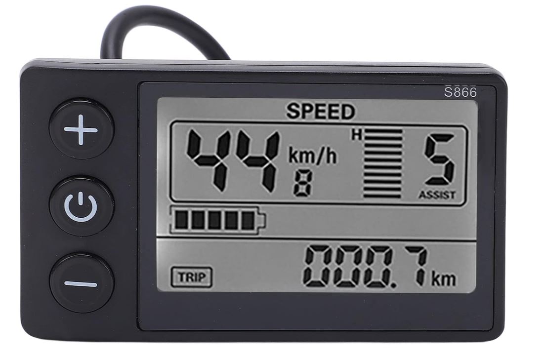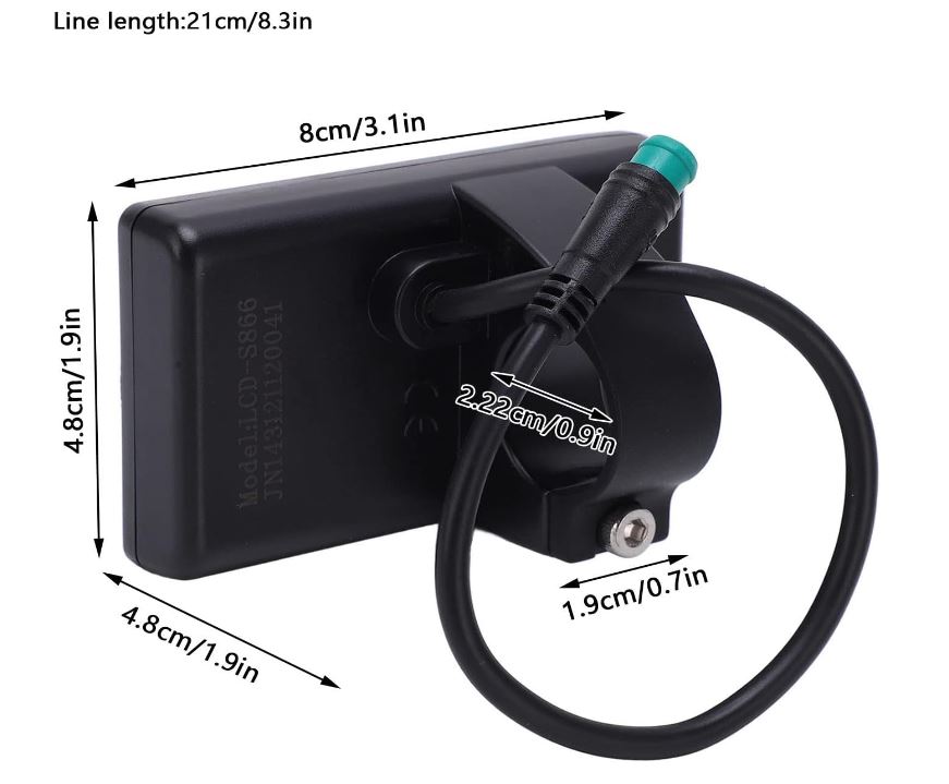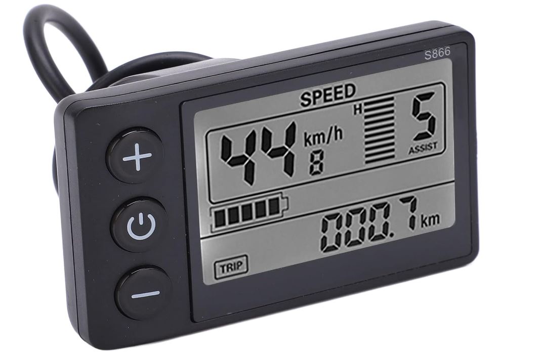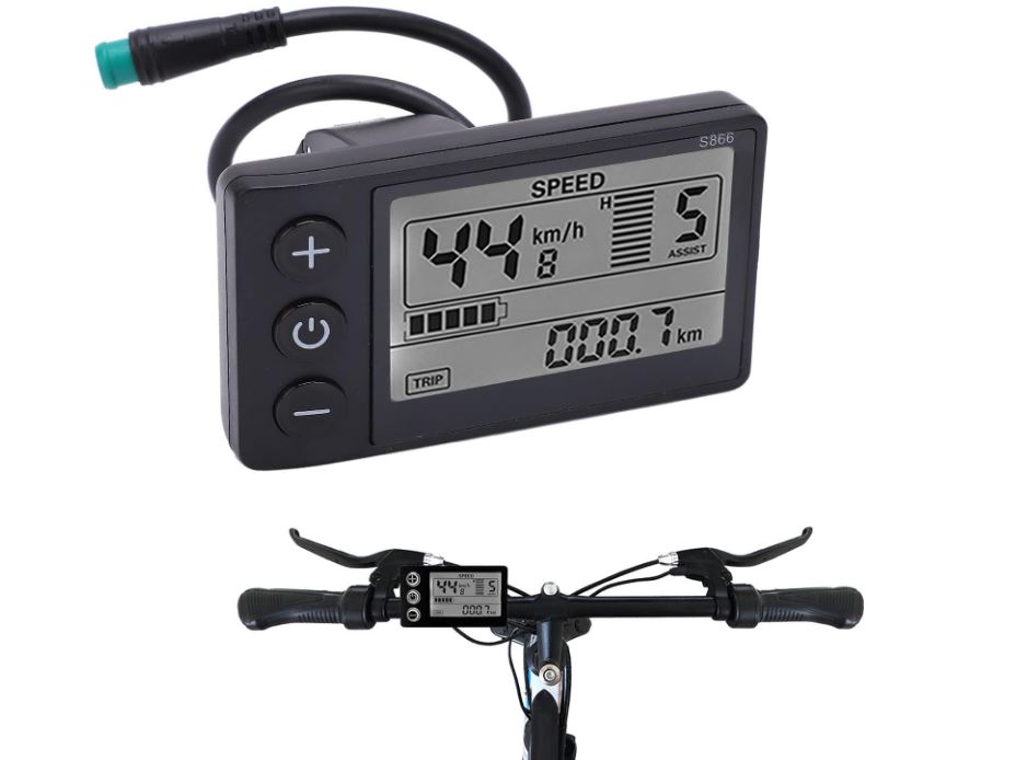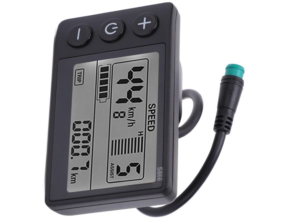 5-пинов дисплей S866 със зелена водо-устойчива букса подходящ за електрически тротинетки и велосипеди. Дисплея поддържа от 24V до 48V литиево-йонни батерии.