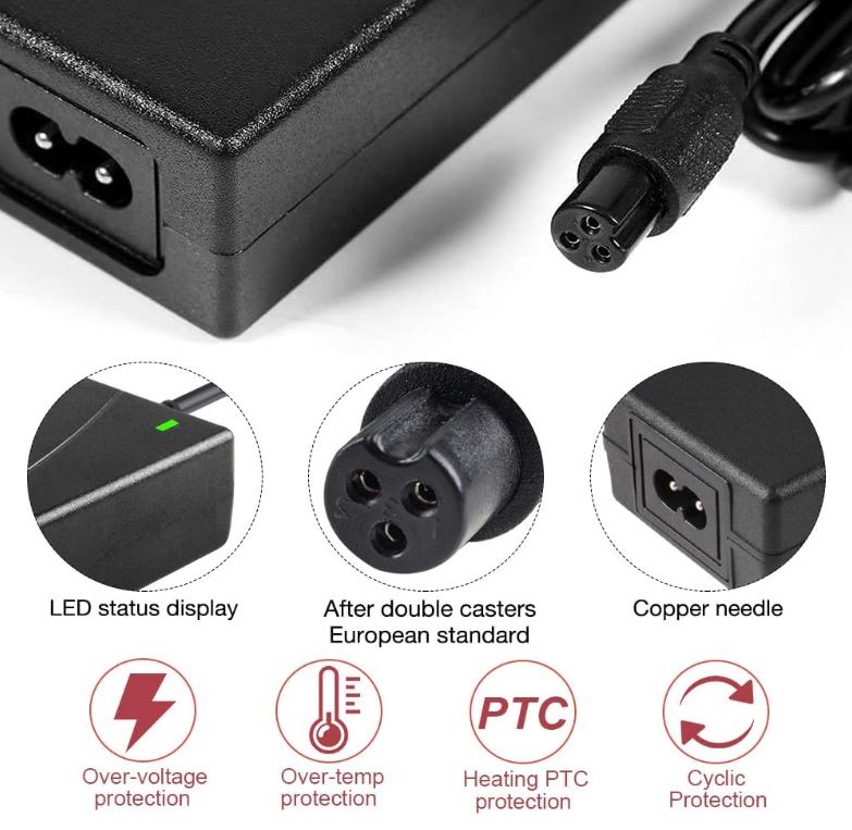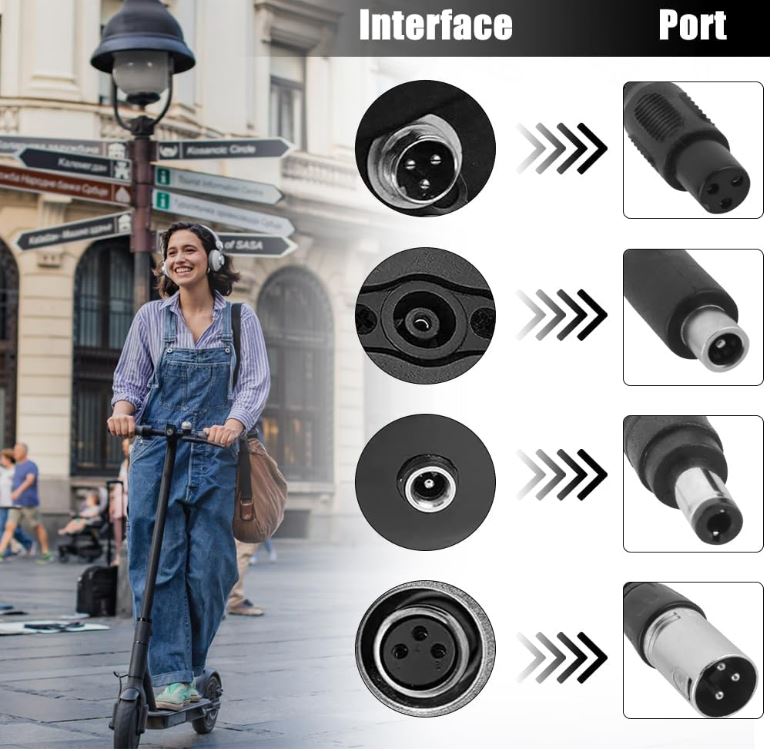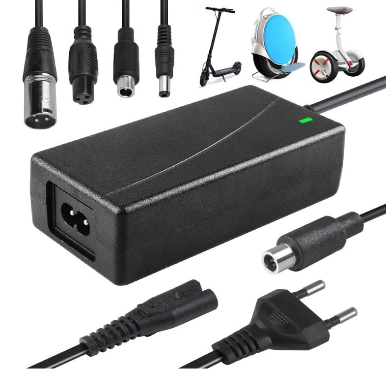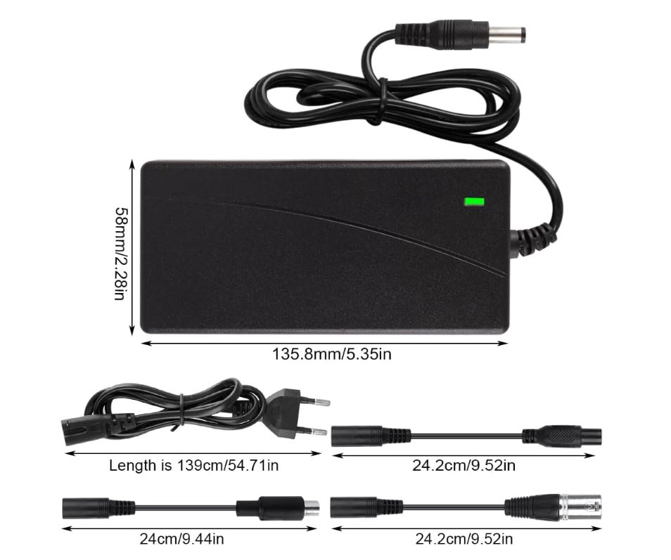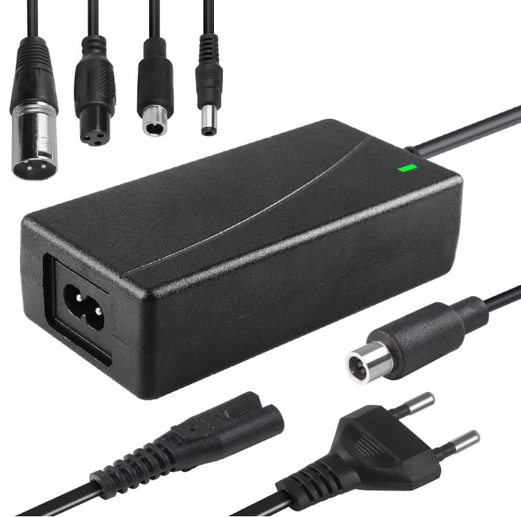 Зарядно устройство 42V 2A с 4 смеяеми букси за зареждане на електрически велосипеди, тротинетки, скутери и ховърборди. Портовете са XLR Head, Xiaomi 8mm, DC5525 (5.5×2.5) и 3P-GX12 Aviation 9mm